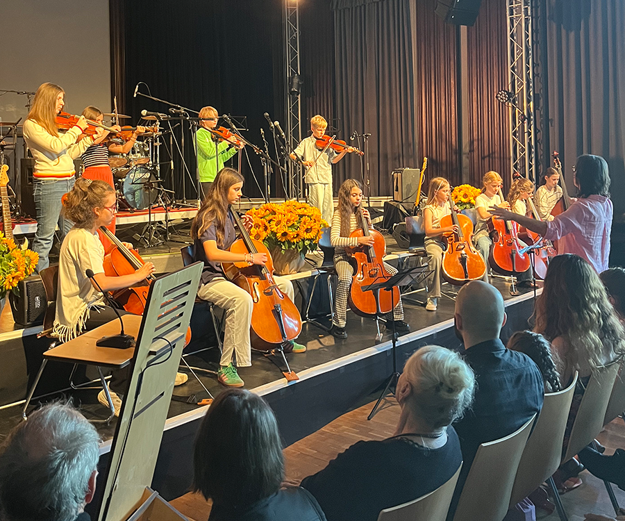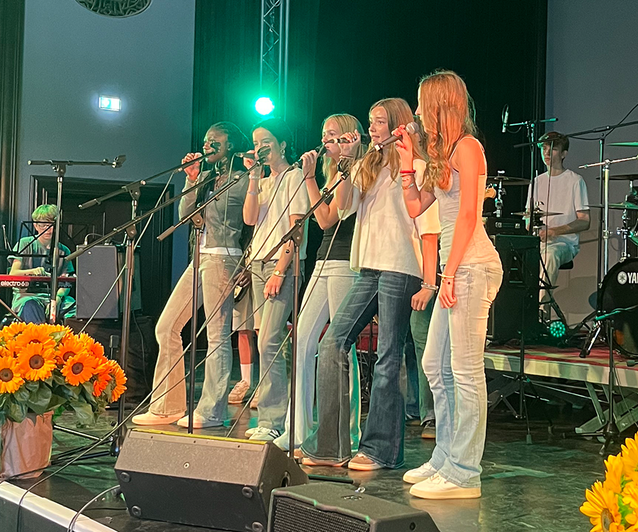 Die heitere Einschulungsfeier war gerahmt durch sehr herzliche Grußworte sowohl von Frau Christophersen als auch von Herrn Wolter. Für ein unterhaltsames Bühnenprogramm sorgten die Streicher-AG, der Chor 6 und die Band 8, die unseren neuen Jahrgang 5 auf herzliche und mitreißende Weise ebenfalls willkommen hießen.